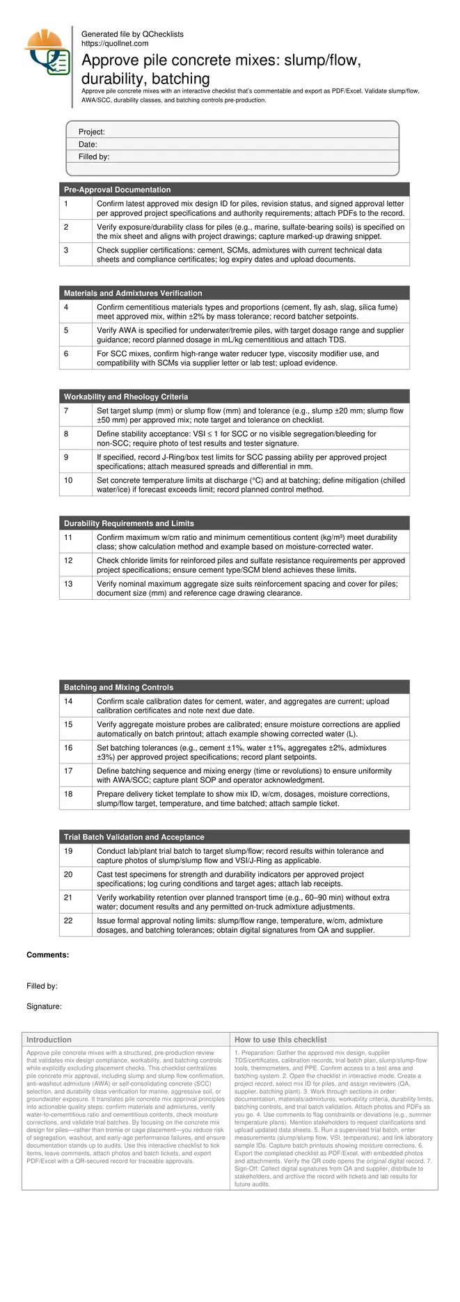 Definition: Approve pile concrete mixes with this QC checklist to validate slump/flow, AWA/SCC use, durability classes, and batching controls before production, excluding placement checks for a clean, spec-compliant approval path.
