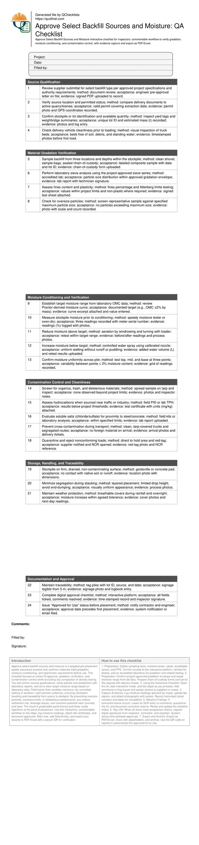 Approve select backfill sources and moisture is a targeted pre-placement quality assurance process that confirms materials meet gradation, moisture conditioning, and cleanliness requirements before use. This checklist focuses on select fill approval, gradation verification, and contamination control while excluding any compaction or density testing. You will confirm source qualifications, verify particle size distribution with laboratory reports, and set a clear target moisture range based on laboratory data. Field teams then condition moisture—by controlled wetting or aeration—and recheck uniformity, ensuring consistent handling and traceability from quarry to stockpile. By preventing oversize particles, excessive fines, or deleterious contaminants, you reduce settlement risk, drainage issues, and corrosion potential near concrete and steel. The result is predictable performance and fewer costly rejections at the point of placement. Use this interactive, commentable workflow to tick steps, log moisture readings, attach lab certificates, and document approvals. Start now, add field photos, and export your records to PDF/Excel with a secure QR for verification.