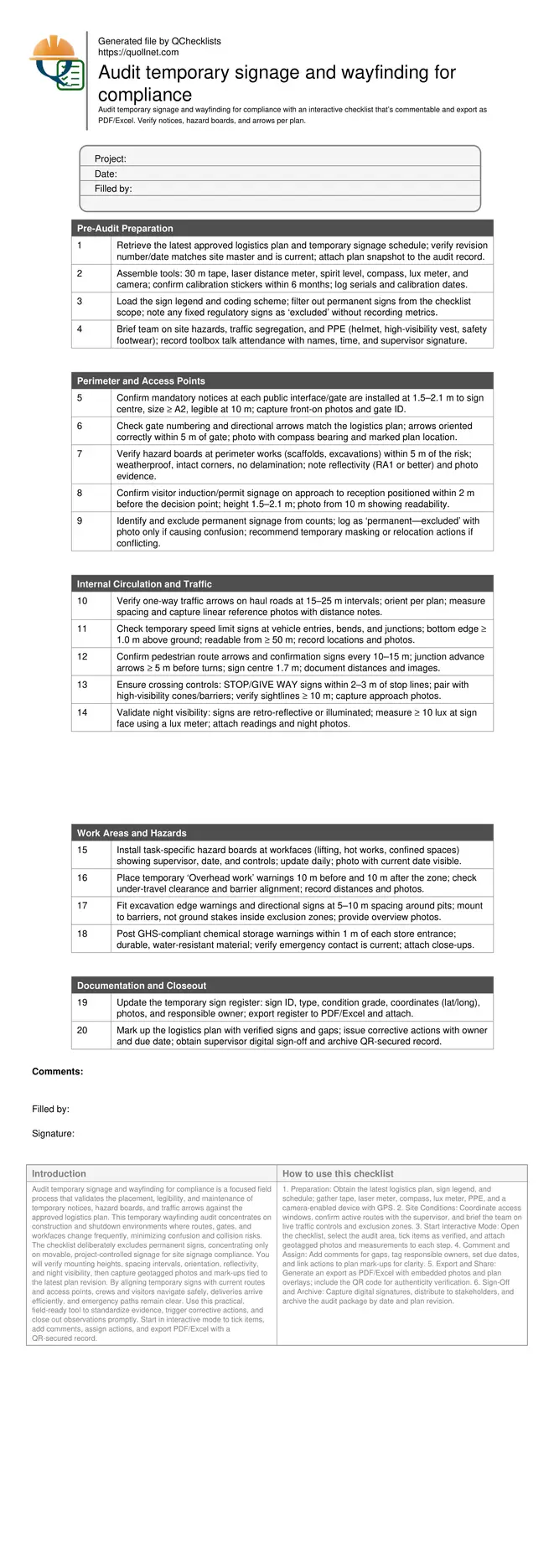 Audit temporary signage and wayfinding for compliance is a focused field process that validates the placement, legibility, and maintenance of temporary notices, hazard boards, and traffic arrows against the approved logistics plan. This temporary wayfinding audit concentrates on construction and shutdown environments where routes, gates, and workfaces change frequently, minimizing confusion and collision risks. The checklist deliberately excludes permanent signs, concentrating only on movable, project-controlled signage for site signage compliance. You will verify mounting heights, spacing intervals, orientation, reflectivity, and night visibility, then capture geotagged photos and mark-ups tied to the latest plan revision. By aligning temporary signs with current routes and access points, crews and visitors navigate safely, deliveries arrive efficiently, and emergency paths remain clear. Use this practical, field-ready tool to standardize evidence, trigger corrective actions, and close out observations promptly. Start in interactive mode to tick items, add comments, assign actions, and export PDF/Excel with a QR-secured record.