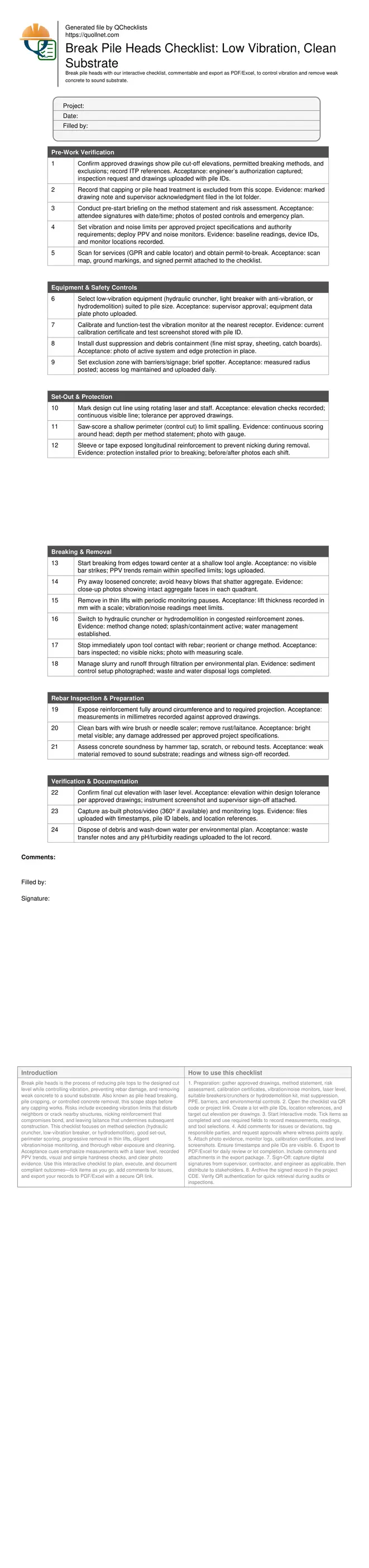 Break pile heads is the process of reducing pile tops to the designed cut level while controlling vibration, preventing rebar damage, and removing weak concrete to a sound substrate. Also known as pile head breaking, pile cropping, or controlled concrete removal, this scope stops before any capping works. Risks include exceeding vibration limits that disturb neighbors or crack nearby structures, nicking reinforcement that compromises bond, and leaving laitance that undermines subsequent construction. This checklist focuses on method selection (hydraulic cruncher, low-vibration breaker, or hydrodemolition), good set-out, perimeter scoring, progressive removal in thin lifts, diligent vibration/noise monitoring, and thorough rebar exposure and cleaning. Acceptance cues emphasize measurements with a laser level, recorded PPV trends, visual and simple hardness checks, and clear photo evidence. Use this interactive checklist to plan, execute, and document compliant outcomes—tick items as you go, add comments for issues, and export your records to PDF/Excel with a secure QR link.