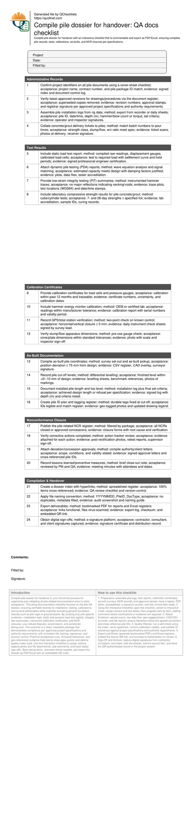 Compile pile dossier for handover is your structured process for organizing and validating all pile-related documentation prior to client acceptance. This piling documentation checklist focuses on the pile QA dossier, ensuring verifiable records for installation, testing, calibrations, and as-built deliverables while explicitly excluding general foundation records such as pile caps or ground beams. By curating only pile-specific evidence—installation logs, static and dynamic load test reports, integrity test summaries, instrument calibration certificates, and NCR closures—you reduce disputes, avoid rework, and accelerate taking-over. The outcome is a clean, traceable package that demonstrates compliance per approved project specifications and authority requirements, with consistent file naming, signatures, and revision control. Practical acceptance cues, SI-based tolerances, and geo-referenced evidence help teams close gaps quickly and defend quality under audit. Use this interactive checklist to assign actions, capture photo and file attachments, add comments, and track digital sign-offs. Start ticking items, comment where needed, and export the dossier as PDF/Excel with an embedded QR code.