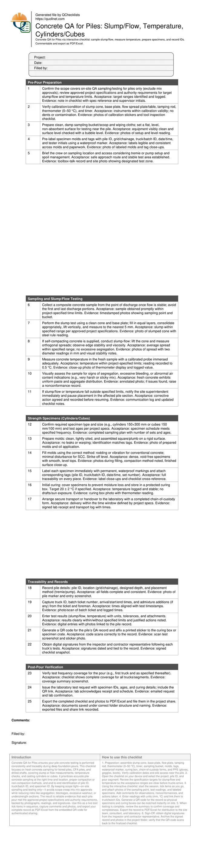 Concrete QA for Piles ensures your pile concrete testing is performed consistently and traceably during deep foundation pours. This checklist focuses on fresh concrete sampling for bored piles, CFA piles, and drilled shafts, covering slump or flow measurements, temperature checks, and casting cylinders or cubes. It prioritizes accurate pile concrete sampling at the right time and location, proper compaction or non-compaction methods, and end-to-end identification of pile ID, truck/batch ID, and specimen ID. By keeping scope tight—on-site sampling and testing only—it avoids scope creep into mix approvals while reducing risks like segregation, blockages, excessive washout, or understrength sections. The result is reliable evidence that each pile pour met the approved project specifications and authority requirements, backed by photographs, readings, and signatures. Use this as a live tool: tick items in sequence, capture comments and photos, and export your complete record as PDF/Excel from the embedded QR code for authenticated sharing.
