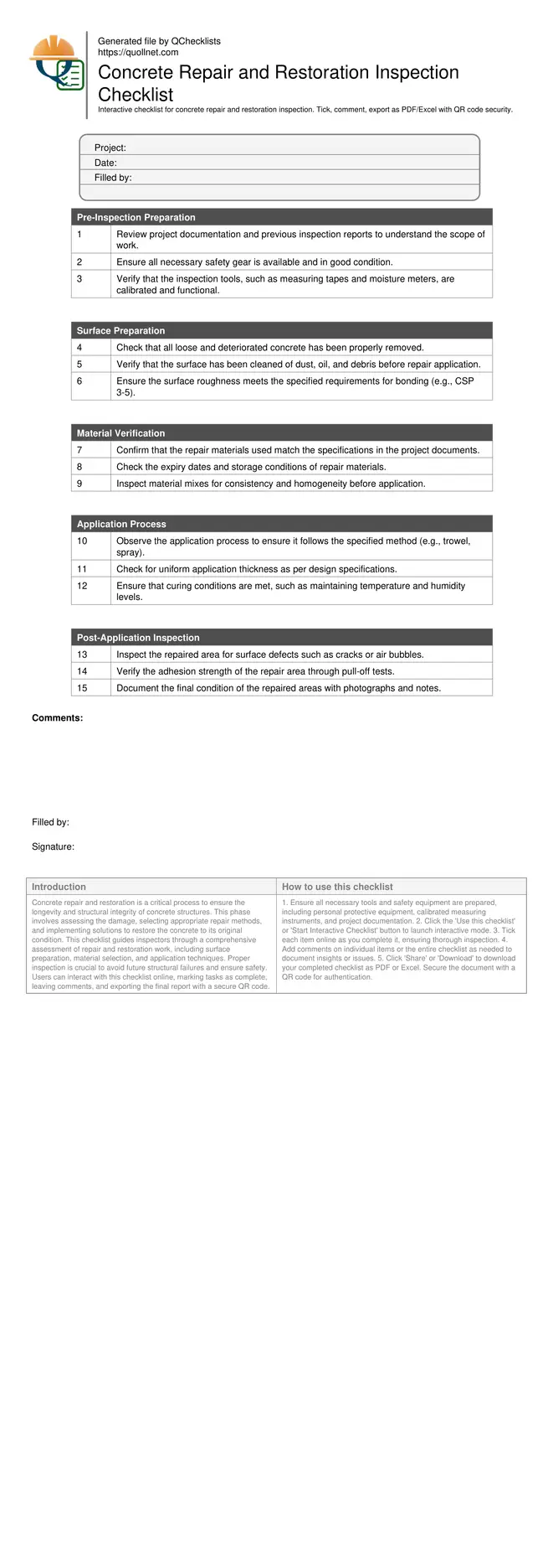 Concrete repair and restoration is a critical process to ensure the longevity and structural integrity of concrete structures. This phase involves assessing the damage, selecting appropriate repair methods, and implementing solutions to restore the concrete to its original condition. This checklist guides inspectors through a comprehensive assessment of repair and restoration work, including surface preparation, material selection, and application techniques. Proper inspection is crucial to avoid future structural failures and ensure safety. Users can interact with this checklist online, marking tasks as complete, leaving comments, and exporting the final report with a secure QR code.