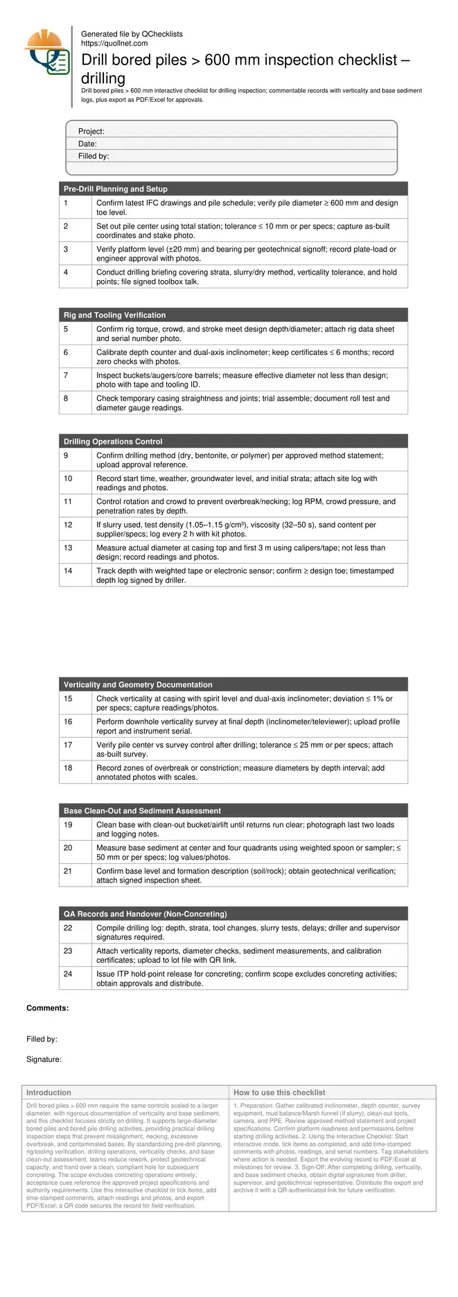 Drill bored piles > 600 mm require the same controls scaled to a larger diameter, with rigorous documentation of verticality and base sediment, and this checklist focuses strictly on drilling. It supports large-diameter bored piles and bored pile drilling activities, providing practical drilling inspection steps that prevent misalignment, necking, excessive overbreak, and contaminated bases. By standardizing pre-drill planning, rig/tooling verification, drilling operations, verticality checks, and base clean-out assessment, teams reduce rework, protect geotechnical capacity, and hand over a clean, compliant hole for subsequent concreting. The scope excludes concreting operations entirely; acceptance cues reference the approved project specifications and authority requirements. Use this interactive checklist to tick items, add time-stamped comments, attach readings and photos, and export PDF/Excel; a QR code secures the record for field verification.