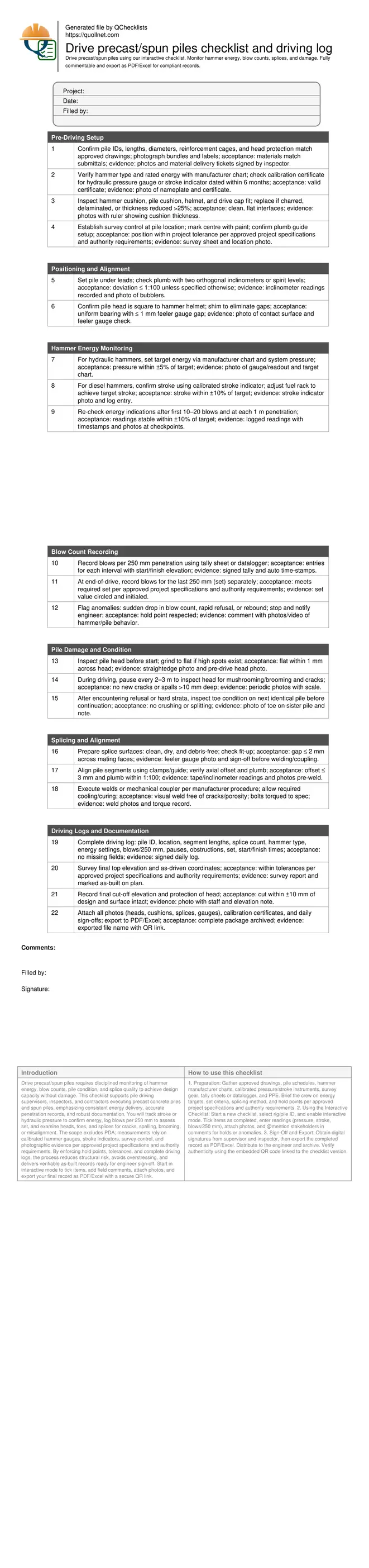 Drive precast/spun piles requires disciplined monitoring of hammer energy, blow counts, pile condition, and splice quality to achieve design capacity without damage. This checklist supports pile driving supervisors, inspectors, and contractors executing precast concrete piles and spun piles, emphasizing consistent energy delivery, accurate penetration records, and robust documentation. You will track stroke or hydraulic pressure to confirm energy, log blows per 250 mm to assess set, and examine heads, toes, and splices for cracks, spalling, brooming, or misalignment. The scope excludes PDA; measurements rely on calibrated hammer gauges, stroke indicators, survey control, and photographic evidence per approved project specifications and authority requirements. By enforcing hold points, tolerances, and complete driving logs, the process reduces structural risk, avoids overstressing, and delivers verifiable as-built records ready for engineer sign-off. Start in interactive mode to tick items, add field comments, attach photos, and export your final record as PDF/Excel with a secure QR link.