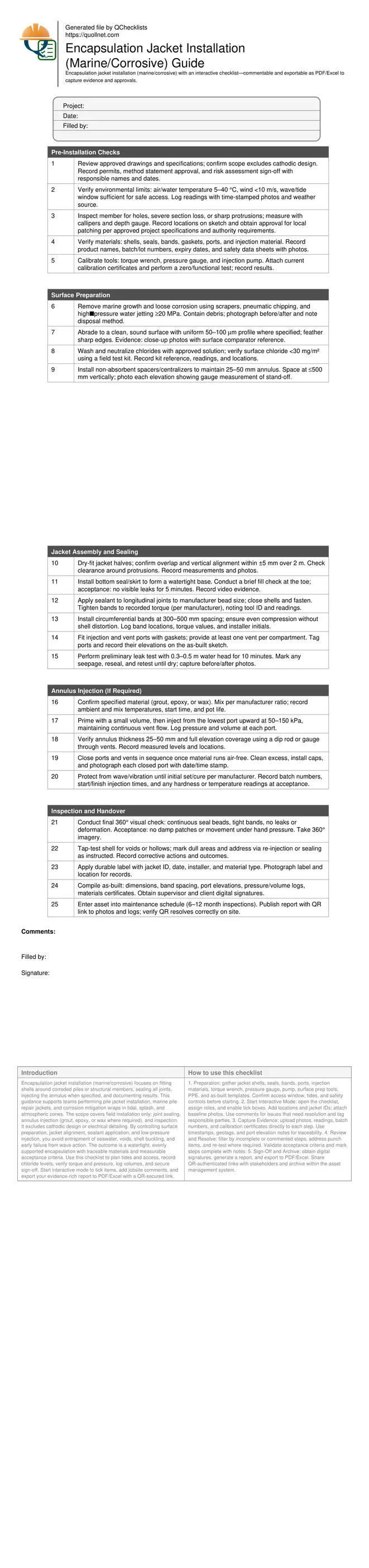 Encapsulation jacket installation (marine/corrosive) focuses on fitting shells around corroded piles or structural members, sealing all joints, injecting the annulus when specified, and documenting results. This guidance supports teams performing pile jacket installation, marine pile repair jackets, and corrosion mitigation wraps in tidal, splash, and atmospheric zones. The scope covers field installation only: joint sealing, annulus injection (grout, epoxy, or wax where required), and inspection. It excludes cathodic design or electrical detailing. By controlling surface preparation, jacket alignment, sealant application, and low-pressure injection, you avoid entrapment of seawater, voids, shell buckling, and early failure from wave action. The outcome is a watertight, evenly supported encapsulation with traceable materials and measurable acceptance criteria. Use this checklist to plan tides and access, record chloride levels, verify torque and pressure, log volumes, and secure sign-off. Start interactive mode to tick items, add jobsite comments, and export your evidence-rich report to PDF/Excel with a QR-secured link.