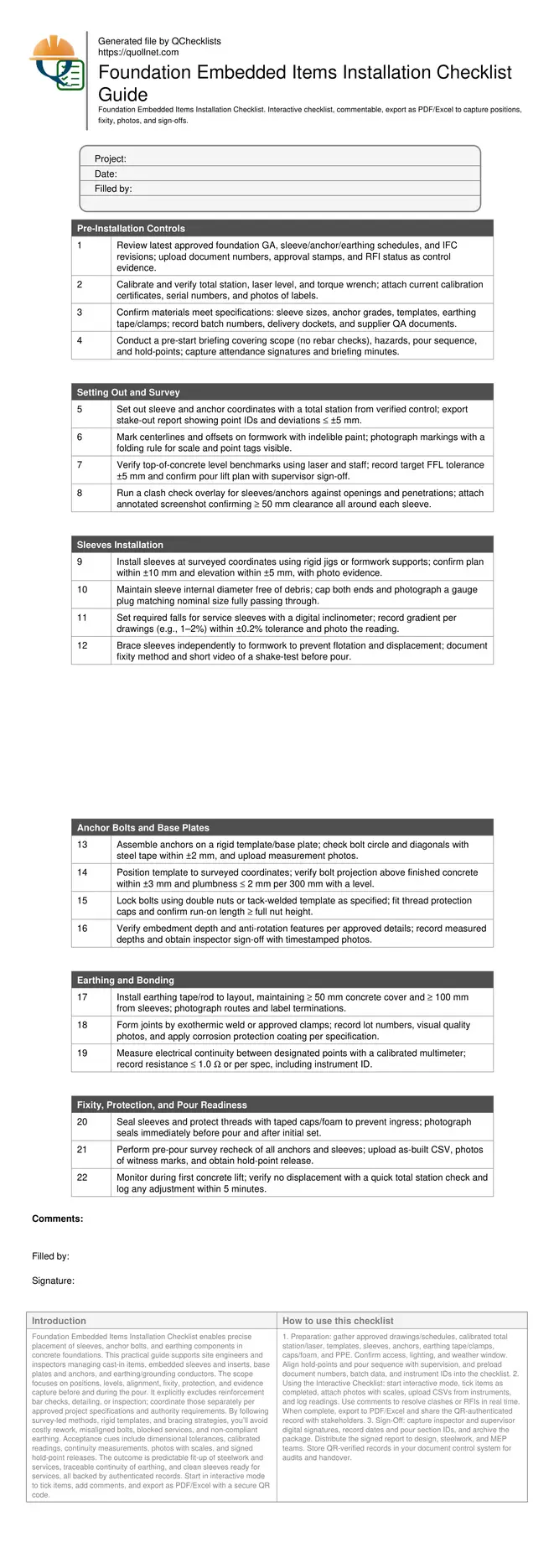 Foundation Embedded Items Installation Checklist enables precise placement of sleeves, anchor bolts, and earthing components in concrete foundations. This practical guide supports site engineers and inspectors managing cast-in items, embedded sleeves and inserts, base plates and anchors, and earthing/grounding conductors. The scope focuses on positions, levels, alignment, fixity, protection, and evidence capture before and during the pour. It explicitly excludes reinforcement bar checks, detailing, or inspection; coordinate those separately per approved project specifications and authority requirements. By following survey-led methods, rigid templates, and bracing strategies, you’ll avoid costly rework, misaligned bolts, blocked services, and non-compliant earthing. Acceptance cues include dimensional tolerances, calibrated readings, continuity measurements, photos with scales, and signed hold-point releases. The outcome is predictable fit-up of steelwork and services, traceable continuity of earthing, and clean sleeves ready for services, all backed by authenticated records. Start in interactive mode to tick items, add comments, and export as PDF/Excel with a secure QR code.
