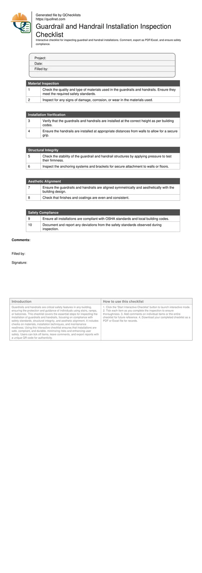 Guardrails and handrails are critical safety features in any building, ensuring the protection and guidance of individuals using stairs, ramps, or balconies. This checklist covers the essential steps for inspecting the installation of guardrails and handrails, focusing on compliance with safety standards, structural integrity, and aesthetic alignment. It includes checks on materials, installation techniques, and maintenance readiness. Using this interactive checklist ensures that installations are safe, compliant, and durable, minimizing risks and enhancing user safety. Users can tick off items, leave comments, and export reports with a unique QR code for authenticity.