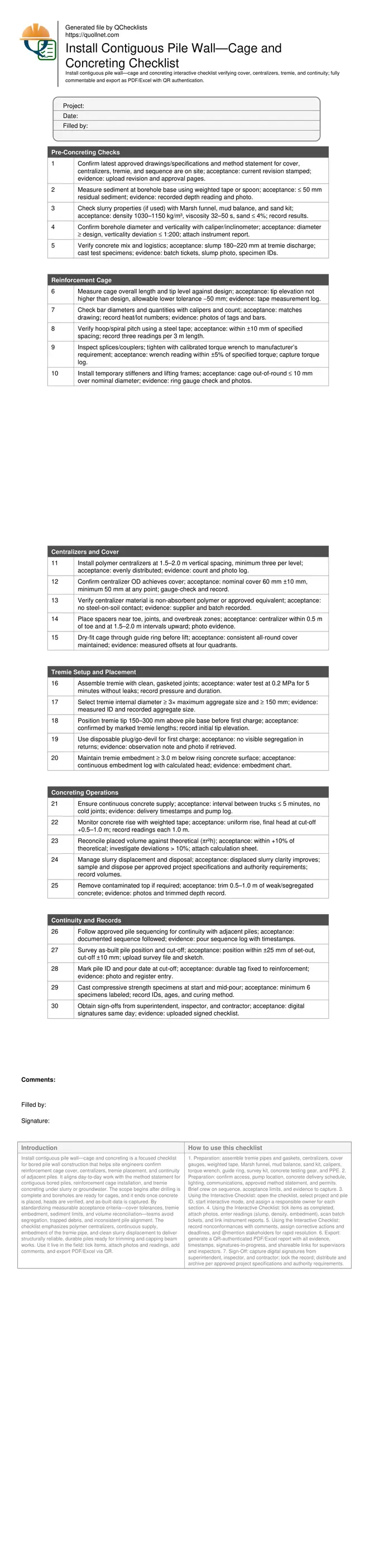 - Improve traceability with consistent records: bar heat numbers, coupler torque, slurry results, and as-built surveys for position and cut-off. Interactive online checklist with tick, comment, and export features secured by QR code. Supervisors see real-time compliance, corrective actions, and close-out status across multiple piles and shifts.