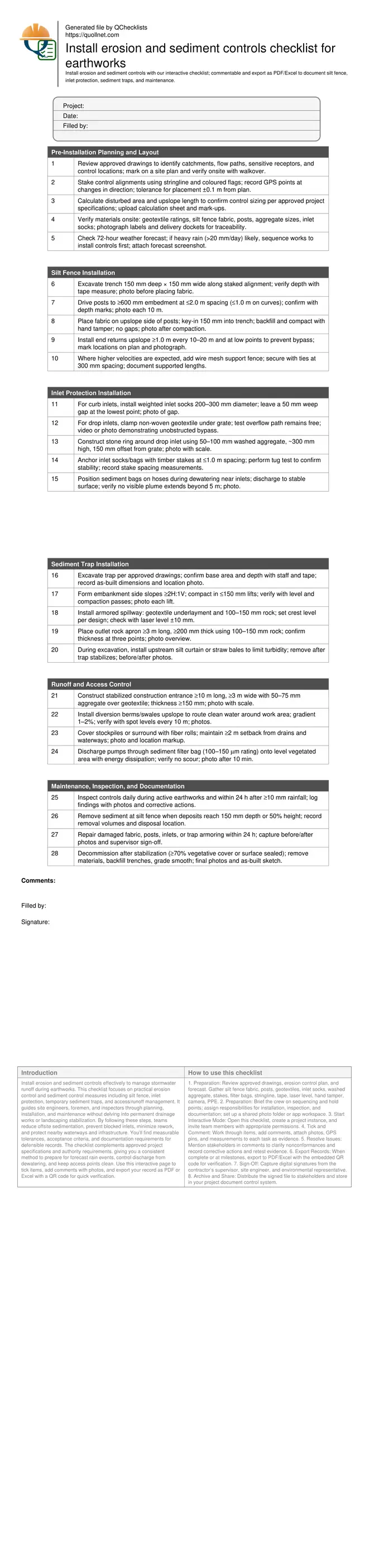 Install erosion and sediment controls effectively to manage stormwater runoff during earthworks. This checklist focuses on practical erosion control and sediment control measures including silt fence, inlet protection, temporary sediment traps, and access/runoff management. It guides site engineers, foremen, and inspectors through planning, installation, and maintenance without delving into permanent drainage works or landscaping stabilization. By following these steps, teams reduce offsite sedimentation, prevent blocked inlets, minimize rework, and protect nearby waterways and infrastructure. You’ll find measurable tolerances, acceptance criteria, and documentation requirements for defensible records. The checklist complements approved project specifications and authority requirements, giving you a consistent method to prepare for forecast rain events, control discharge from dewatering, and keep access points clean. Use this interactive page to tick items, add comments with photos, and export your record as PDF or Excel with a QR code for quick verification.