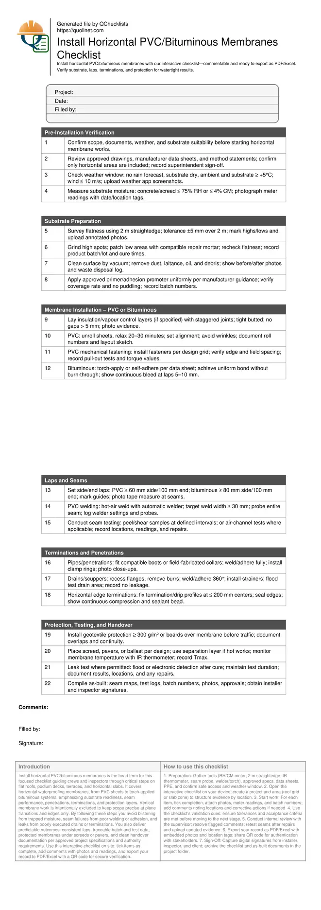 - This checklist standardizes horizontal PVC and bituminous membrane installation by verifying substrate moisture, levelness, and compatibility, then controlling seams, penetrations, and terminations. It helps teams prevent trapped moisture, fish-mouths, poor welds, and damage before protection layers go down.