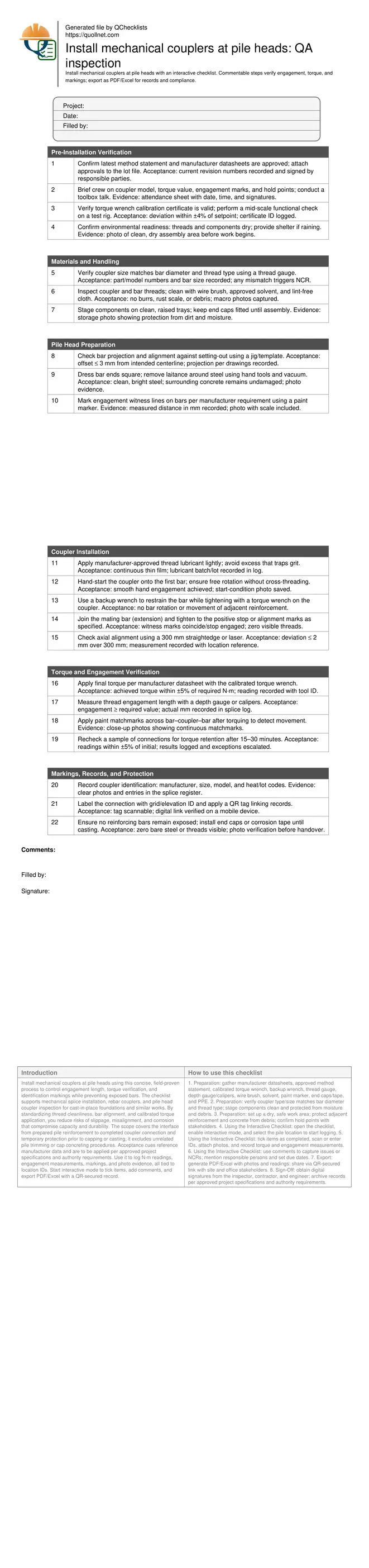 - This checklist standardizes mechanical coupler installation at pile heads by controlling thread engagement, torque, and bar alignment. It reduces splice failures, prevents corrosion from exposed steel, and creates verifiable records suitable for audits, handovers, and quality closeout packages.