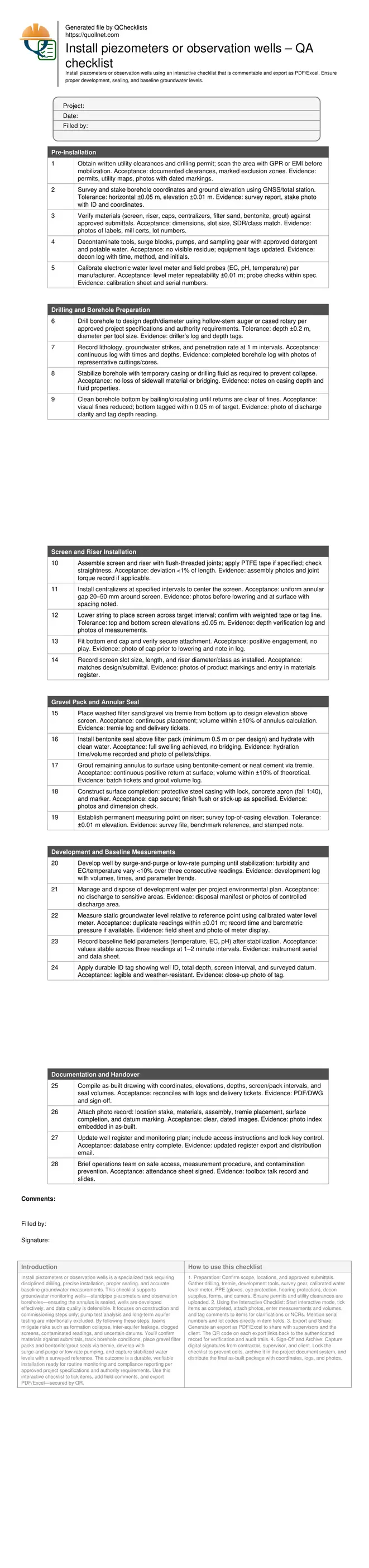 Install piezometers or observation wells is a specialized task requiring disciplined drilling, precise installation, proper sealing, and accurate baseline groundwater measurements. This checklist supports groundwater monitoring wells—standpipe piezometers and observation boreholes—ensuring the annulus is sealed, wells are developed effectively, and data quality is defensible. It focuses on construction and commissioning steps only; pump test analysis and long-term aquifer testing are intentionally excluded. By following these steps, teams mitigate risks such as formation collapse, inter-aquifer leakage, clogged screens, contaminated readings, and uncertain datums. You’ll confirm materials against submittals, track borehole conditions, place gravel filter packs and bentonite/grout seals via tremie, develop with surge-and-purge or low-rate pumping, and capture stabilized water levels with a surveyed reference. The outcome is a durable, verifiable installation ready for routine monitoring and compliance reporting per approved project specifications and authority requirements. Use this interactive checklist to tick items, add field comments, and export PDF/Excel—secured by QR.