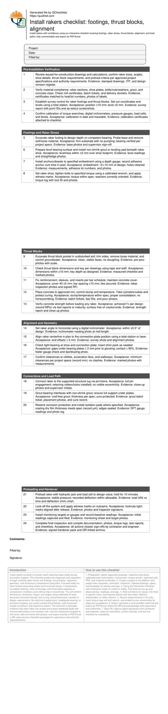 Install rakers correctly to transfer earth-retaining loads safely during excavation support. This checklist guides site engineers and inspectors through verifying raker shoes and footings, thrust blocks, alignment geometry, and continuous compressive load paths. Focused solely on raker braces (excluding walers and horizontal struts), it emphasizes foundation bearing, shoe anchorage, and thrust block capacity so compression members work without slip or eccentricity. You will confirm dimensions, levelness, torque, and angles using calibrated SI tools, document concrete strength and curing, and preload each member to design requirements. By catching misalignment, inadequate bearing, or premature loading, you avoid cracked thrust blocks, wall movement, unsafe conditions, and expensive rework. The outcome is traceable evidence that each raker can accept and sustain predicted loads with minimal deformation and corrosion risk. Use this interactive template to tick items, add comments with photos, and export records to PDF/Excel; a QR code secures shareable packages for supervisors and authority representatives.