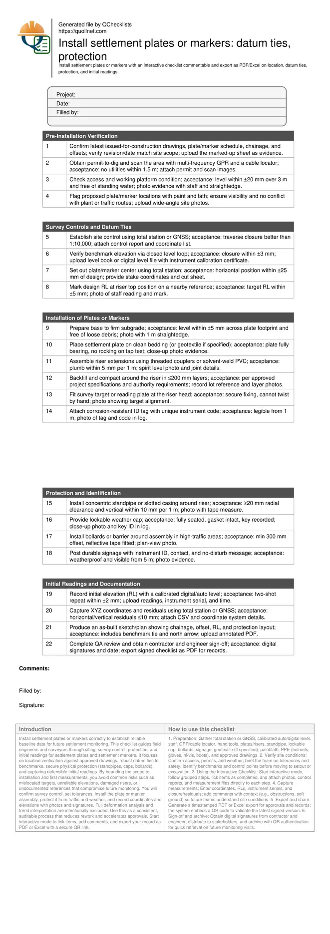 Install settlement plates or markers correctly to establish reliable baseline data for future settlement monitoring. This checklist guides field engineers and surveyors through siting, survey control, protection, and initial readings for settlement plates and settlement markers. It focuses on location verification against approved drawings, robust datum ties to benchmarks, secure physical protection (standpipes, caps, bollards), and capturing defensible initial readings. By bounding the scope to installation and first measurements, you avoid common risks such as mislocated targets, unreliable elevations, damaged risers, or undocumented references that compromise future monitoring. You will confirm survey control, set tolerances, install the plate or marker assembly, protect it from traffic and weather, and record coordinates and elevations with photos and signatures. Full deformation analysis and trend interpretation are intentionally excluded. Use this as a consistent, auditable process that reduces rework and accelerates approvals. Start interactive mode to tick items, add comments, and export your record as PDF or Excel with a secure QR link.