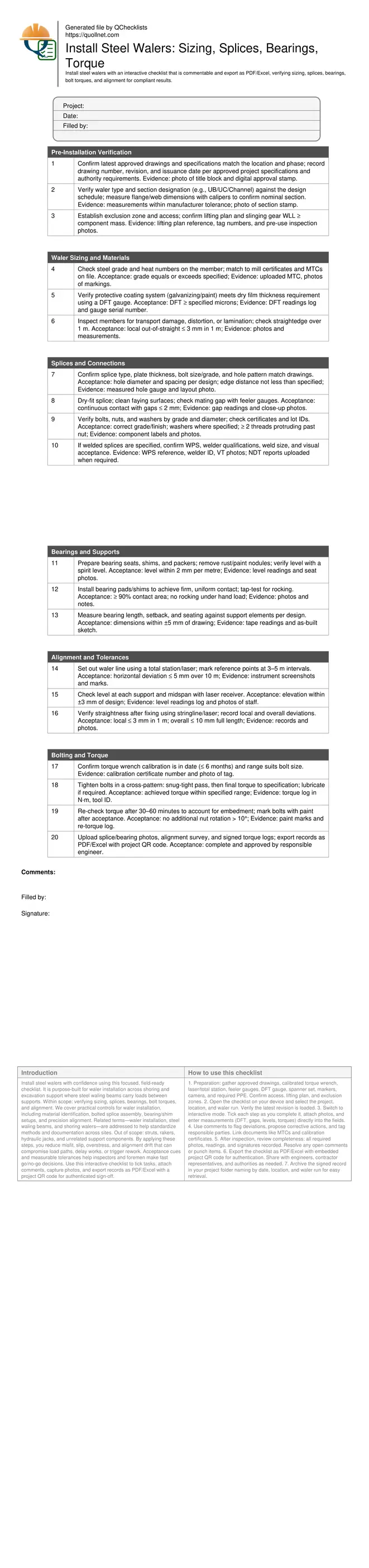 How to Use This Install Steel Walers Checklist