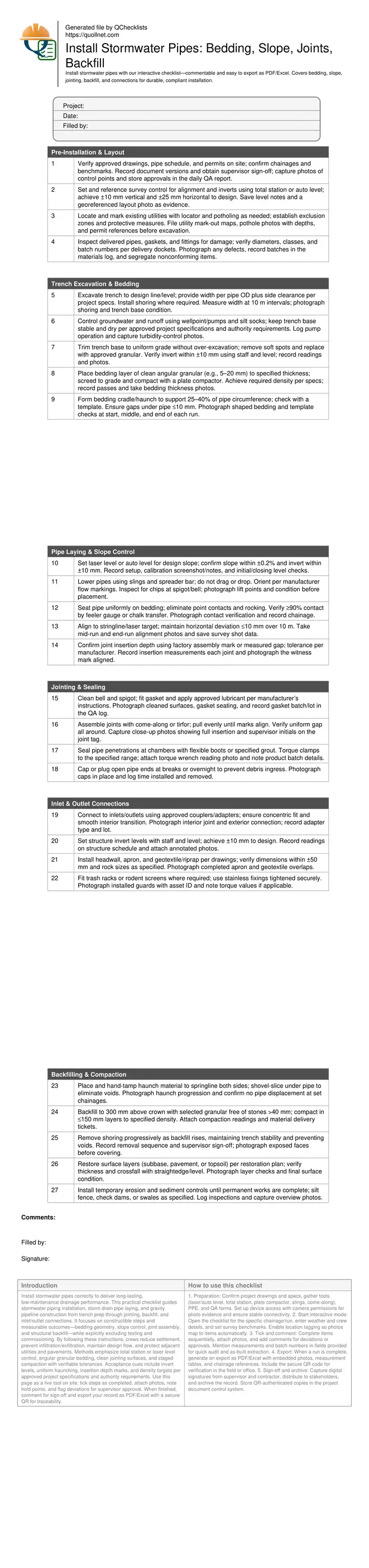 Install stormwater pipes correctly to deliver long-lasting, low-maintenance drainage performance. This practical checklist guides stormwater piping installation, storm drain pipe laying, and gravity pipeline construction from trench prep through jointing, backfill, and inlet/outlet connections. It focuses on constructible steps and measurable outcomes—bedding geometry, slope control, joint assembly, and structural backfill—while explicitly excluding testing and commissioning. By following these instructions, crews reduce settlement, prevent infiltration/exfiltration, maintain design flow, and protect adjacent utilities and pavements. Methods emphasize total station or laser level control, angular granular bedding, clean jointing surfaces, and staged compaction with verifiable tolerances. Acceptance cues include invert levels, uniform haunching, insertion depth marks, and density targets per approved project specifications and authority requirements. Use this page as a live tool on site: tick steps as completed, attach photos, note hold points, and flag deviations for supervisor approval. When finished, comment for sign-off and export your record as PDF/Excel with a secure QR for traceability.