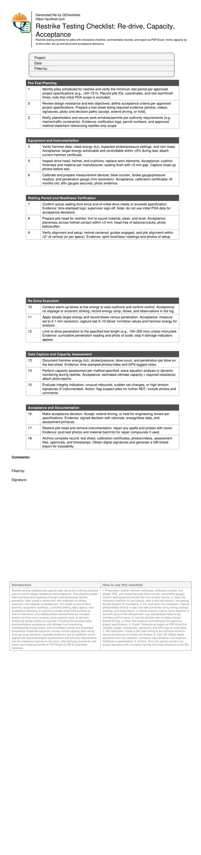 Restrike testing validates pile capacity after set-up by re-driving selected piles to confirm design resistance and acceptance. This checklist guides field engineers and inspectors through a disciplined pile restrike procedure, often called a redrive test, with emphasis on timing, execution, and capacity re-assessment. The scope covers re-drive planning, equipment readiness, controlled striking, data capture, and acceptance decisions. It explicitly excludes initial PDA activities at end-of-initial-drive; only restrike-phase assessments are included, whether by blow count analysis, wave equation tools, or dynamic monitoring during restrike as required. Following this process helps avoid premature acceptance, pile damage from overdriving, misinterpreted energy levels, and incomplete records that jeopardize compliance. Expected outcomes include verified capacity after set-up, clear go/no-go decisions, traceable evidence, and an auditable record aligned with approved project specifications and authority requirements. Use the interactive features to tick items, add clarifying comments, and export your evidence bundle to PDF/Excel via QR for seamless handover.