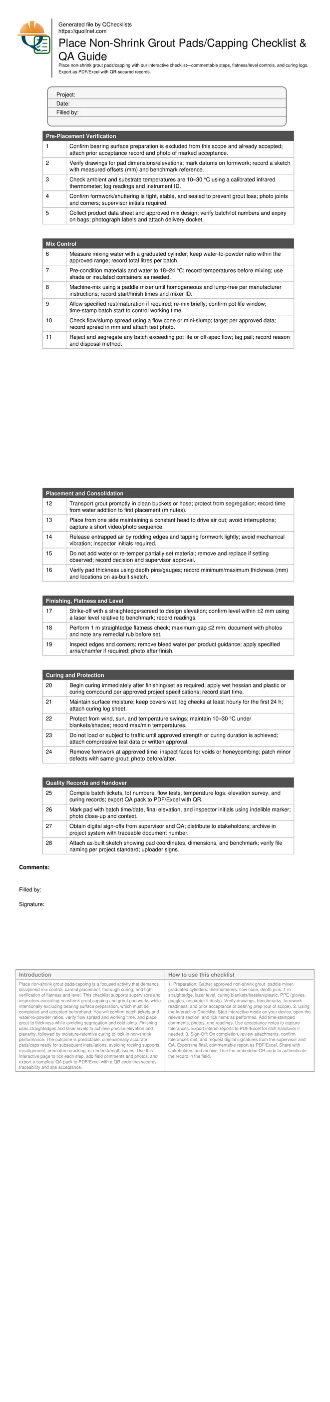 Place non-shrink grout pads/capping is a focused activity that demands disciplined mix control, careful placement, thorough curing, and tight verification of flatness and level. This checklist supports supervisors and inspectors executing nonshrink grout capping and grout pad works while intentionally excluding bearing surface preparation, which must be completed and accepted beforehand. You will confirm batch tickets and water-to-powder ratios, verify flow spread and working time, and place grout to thickness while avoiding segregation and cold joints. Finishing uses straightedges and laser levels to achieve precise elevation and planarity, followed by moisture-retentive curing to lock in non-shrink performance. The outcome is predictable, dimensionally accurate pads/caps ready for subsequent installations, avoiding rocking supports, misalignment, premature cracking, or understrength issues. Use this interactive page to tick each step, add field comments and photos, and export a complete QA pack to PDF/Excel with a QR code that secures traceability and site acceptance.
