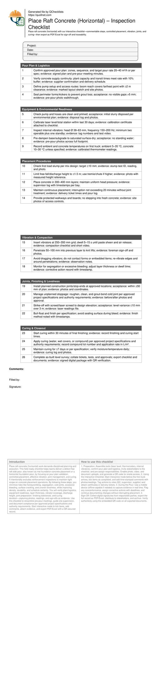 Place raft concrete (horizontal) work demands disciplined planning and execution. This field-ready checklist helps teams deliver a defect-free raft slab pour, also known as mat foundation concrete placement or a horizontal foundation pour, by focusing on pour plan validation, controlled placement, effective vibration, joint management, and curing. It intentionally excludes reinforcement inspections to maintain tight scope on concrete placement operations. By following these steps, you minimize risks like honeycombing, segregation, cold joints, excessive bleeding, surface cracking, and uneven levelness, while improving density, durability, and schedule certainty. You will verify plant logistics, equipment readiness, layer thickness, vibrator coverage, discharge height, joint preparation, finishing tolerances, and curing duration—capturing photos, readings, and sign-offs as evidence. Use this checklist to streamline pre-pour meetings, guide site supervision, and document compliance per approved project specifications and authority requirements. Start interactive mode to tick items, add comments, attach evidence, and export PDF/Excel with a QR-secured record.