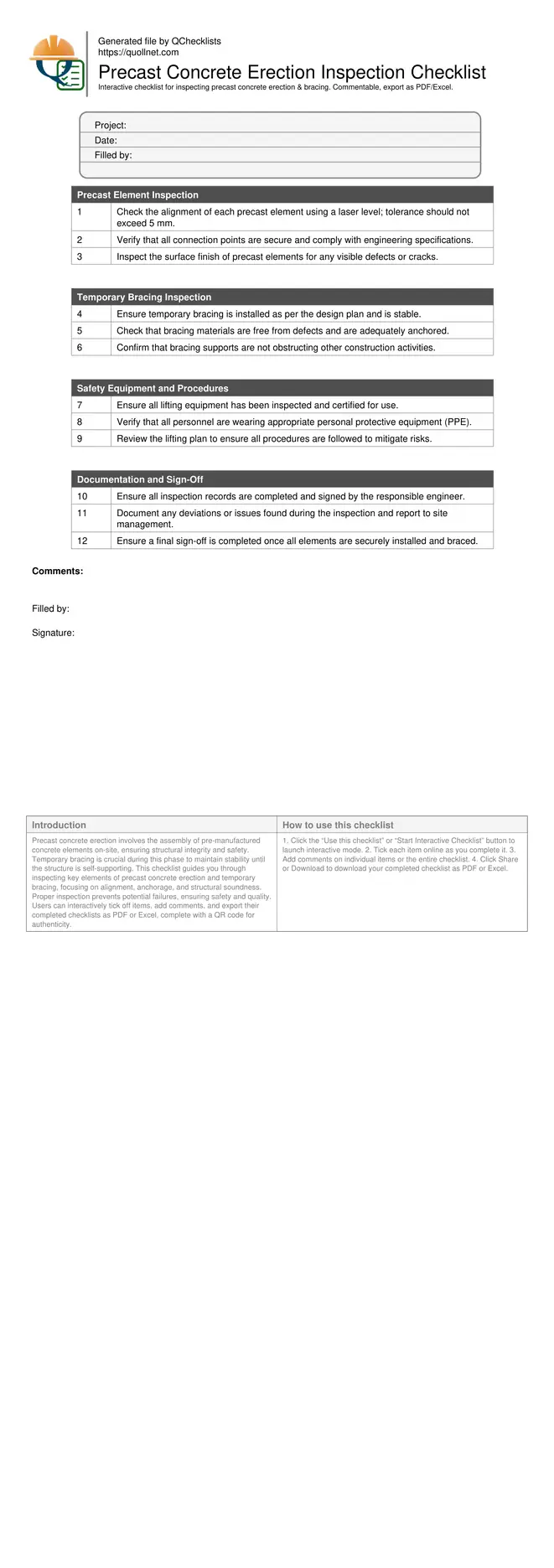 Precast concrete erection involves the assembly of pre-manufactured concrete elements on-site, ensuring structural integrity and safety. Temporary bracing is crucial during this phase to maintain stability until the structure is self-supporting. This checklist guides you through inspecting key elements of precast concrete erection and temporary bracing, focusing on alignment, anchorage, and structural soundness. Proper inspection prevents potential failures, ensuring safety and quality. Users can interactively tick off items, add comments, and export their completed checklists as PDF or Excel, complete with a QR code for authenticity.