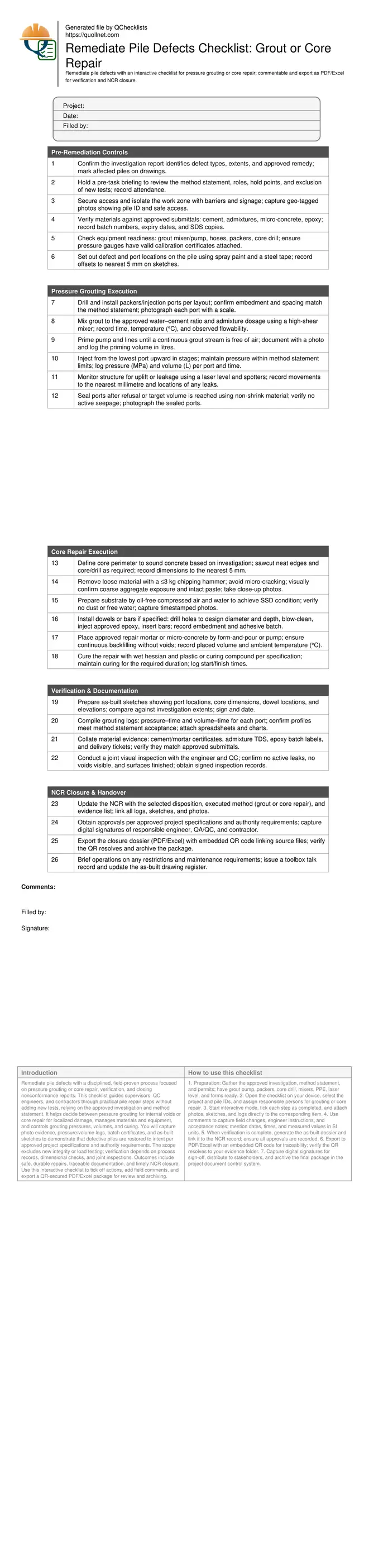 Remediate pile defects with a disciplined, field-proven process focused on pressure grouting or core repair, verification, and closing nonconformance reports. This checklist guides supervisors, QC engineers, and contractors through practical pile repair steps without adding new tests, relying on the approved investigation and method statement. It helps decide between pressure grouting for internal voids or core repair for localized damage, manages materials and equipment, and controls grouting pressures, volumes, and curing. You will capture photo evidence, pressure/volume logs, batch certificates, and as-built sketches to demonstrate that defective piles are restored to intent per approved project specifications and authority requirements. The scope excludes new integrity or load testing; verification depends on process records, dimensional checks, and joint inspections. Outcomes include safe, durable repairs, traceable documentation, and timely NCR closure. Use this interactive checklist to tick off actions, add field comments, and export a QR-secured PDF/Excel package for review and archiving.