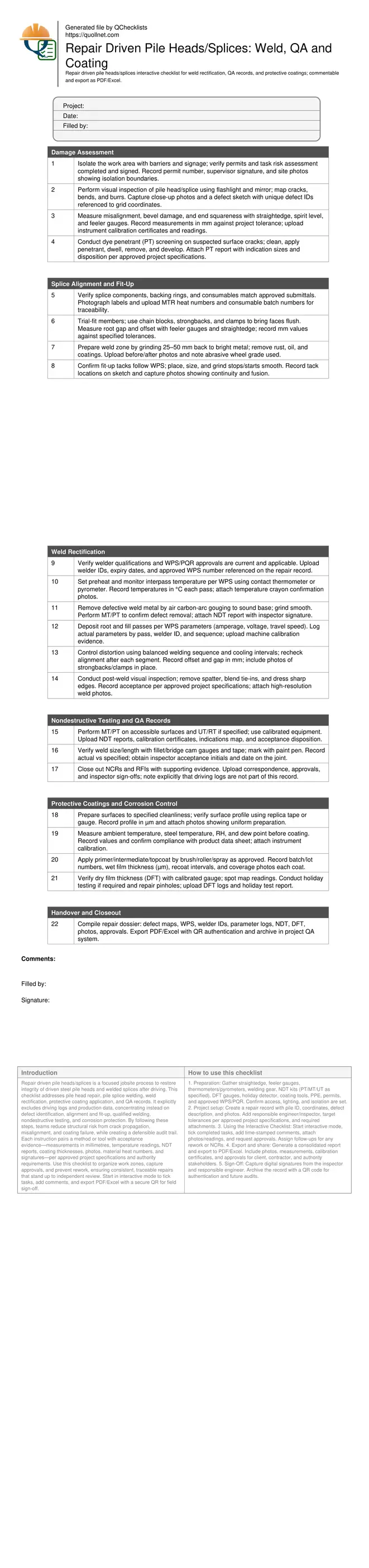 Definition: Repair driven pile heads/splices checklist for site engineers and inspectors, covering damage assessment, weld rectification, QA documentation, and protective coatings, while excluding production pile driving logs.