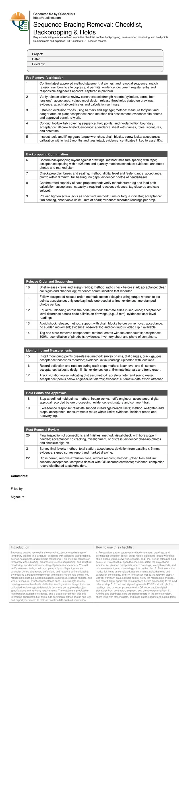 Sequence bracing removal is the controlled, documented release of temporary bracing in a structure, executed with validated backpropping, defined hold points, and real-time monitoring. This checklist focuses on temporary works bracing, progressive release sequencing, and structural monitoring, not demolition or cutting of permanent members. You will verify release criteria, confirm prop capacity and layout, maintain exclusion zones, and record deflections and rotations while unloading. By following a staged release order with clear stop-go hold points, you reduce risks such as sudden instability, overstress, cracked finishes, and worker exposure. Practical acceptance cues—like strength results meeting release thresholds, deflection readings within design limits, and calibrated tools—support defensible decisions per approved project specifications and authority requirements. The outcome is predictable load transfer, auditable evidence, and a clean sign-off trail. Use this interactive checklist to tick items, add comments, attach photos and logs, and export your record to PDF or Excel via QR-enabled verification.