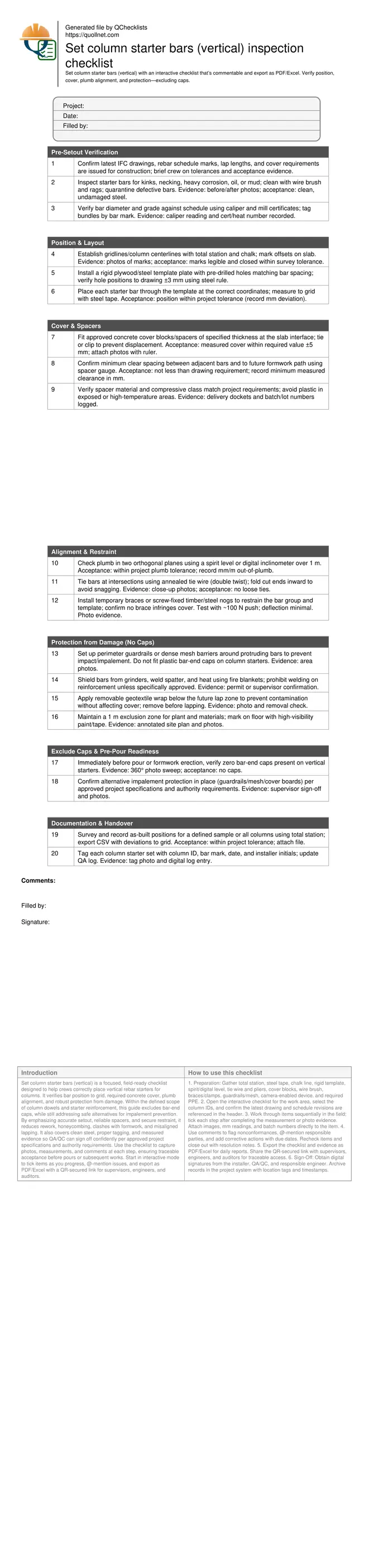 - This checklist drives precise positioning of vertical column starter bars against layout lines, validated with templates, tapes, and total station points. It ensures clean steel, correct identification, and documented evidence with photos, measurements, and signatures, reducing rework and ensuring the next trade can proceed without delays.