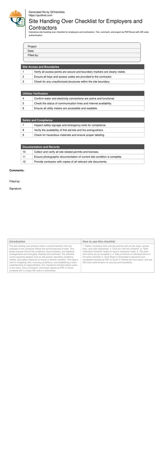 The site handing over process marks a crucial transition from the employer to the contractor before the commencement of work. This phase ensures that all site conditions, documentation, and logistical arrangements are thoroughly checked and confirmed. The checklist covers essential aspects such as site access, boundary conditions, utilities, and safety measures to ensure a smooth transition. This step is vital for mitigating risks, ensuring compliance, and establishing a clear understanding of responsibilities. Our interactive checklist allows users to tick items, leave comments, and export reports as PDF or Excel, complete with a unique QR code for authenticity.