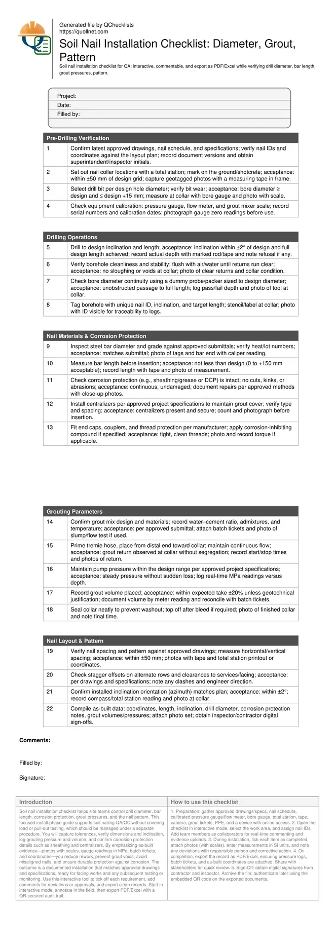 Soil nail installation checklist helps site teams control drill diameter, bar length, corrosion protection, grout pressures, and the nail pattern. This focused install-phase guide supports soil nailing QA/QC without covering load or pull-out testing, which should be managed under a separate procedure. You will capture tolerances, verify dimensions and inclination, log grouting pressure and volume, and confirm corrosion protection details such as sheathing and centralizers. By emphasizing as-built evidence—photos with scales, gauge readings in MPa, batch tickets, and coordinates—you reduce rework, prevent grout voids, avoid misaligned nails, and ensure durable protection against corrosion. The outcome is a documented installation that matches approved drawings and specifications, ready for facing works and any subsequent testing or monitoring. Use this interactive tool to tick off each requirement, add comments for deviations or approvals, and export clean records. Start in interactive mode, annotate in the field, then export PDF/Excel with a QR-secured audit trail.