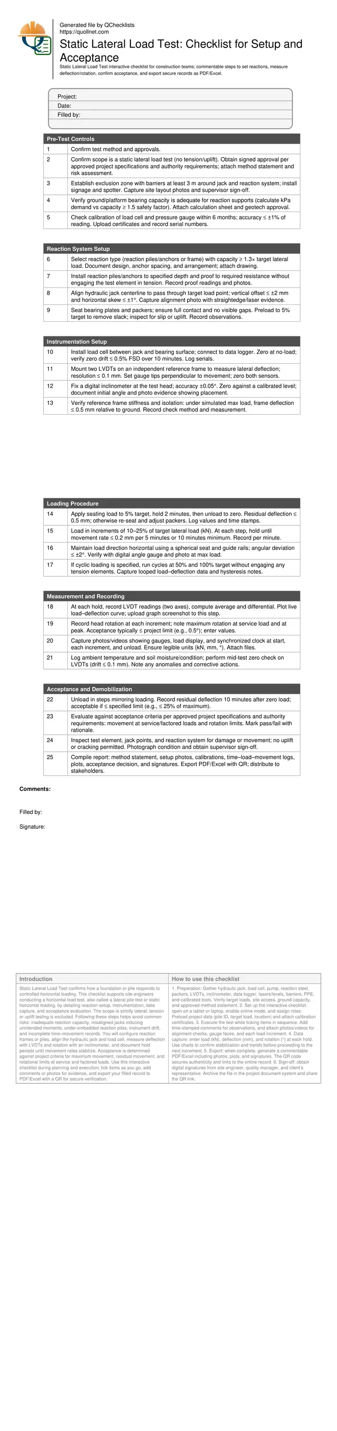 Static Lateral Load Test confirms how a foundation or pile responds to controlled horizontal loading. This checklist supports site engineers conducting a horizontal load test, also called a lateral pile test or static horizontal loading, by detailing reaction setup, instrumentation, data capture, and acceptance evaluation. The scope is strictly lateral; tension or uplift testing is excluded. Following these steps helps avoid common risks: inadequate reaction capacity, misaligned jacks inducing unintended moments, under-embedded reaction piles, instrument drift, and incomplete time–movement records. You will configure reaction frames or piles, align the hydraulic jack and load cell, measure deflection with LVDTs and rotation with an inclinometer, and document hold periods until movement rates stabilize. Acceptance is determined against project criteria for maximum movement, residual movement, and rotational limits at service and factored loads. Use this interactive checklist during planning and execution; tick items as you go, add comments or photos for evidence, and export your filled record to PDF/Excel with a QR for secure verification.
