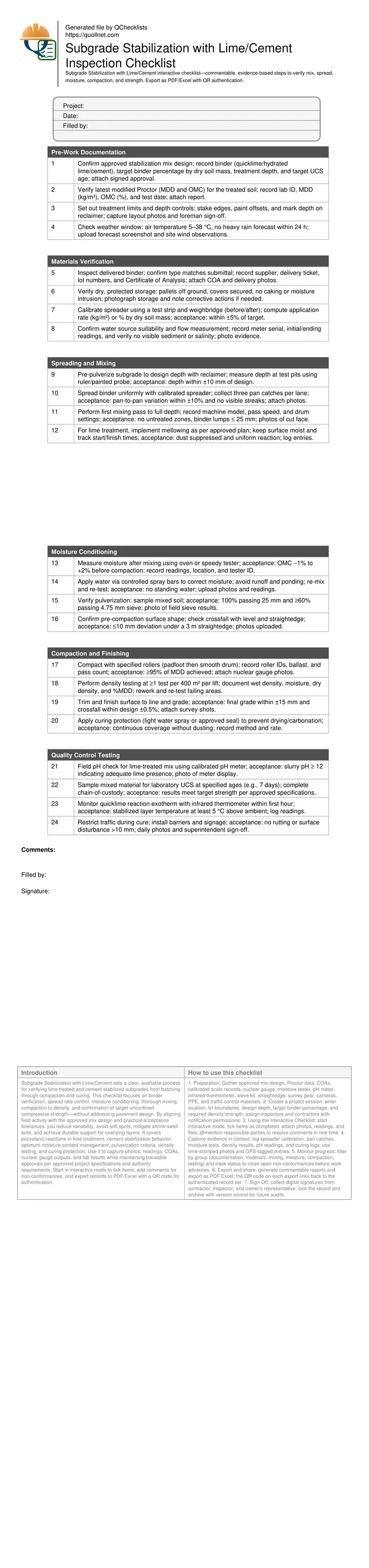 Subgrade Stabilization with Lime/Cement sets a clear, auditable process for verifying lime-treated and cement-stabilized subgrades from batching through compaction and curing. This checklist focuses on binder verification, spread rate control, moisture conditioning, thorough mixing, compaction to density, and confirmation of target unconfined compressive strength—without addressing pavement design. By aligning field activity with the approved mix design and practical acceptance tolerances, you reduce variability, avoid soft spots, mitigate shrink-swell soils, and achieve durable support for overlying layers. It covers pozzolanic reactions in lime treatment, cement stabilization behavior, optimum moisture content management, pulverization criteria, density testing, and curing protection. Use it to capture photos, readings, COAs, nuclear gauge outputs, and lab results while maintaining traceable approvals per approved project specifications and authority requirements. Start in interactive mode to tick items, add comments for non-conformances, and export records to PDF/Excel with a QR code for authentication.