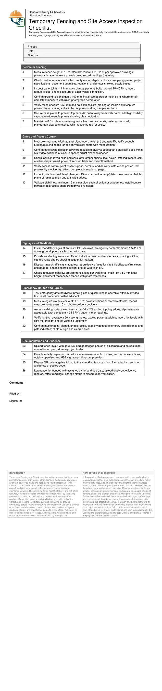 Temporary Fencing and Site Access Inspection ensures that temporary perimeter barriers, entry gates, safety signage, and emergency routes align with approved plans and keep people and assets safe. This focused scope covers temporary site fencing inspection, site access control, and perimeter security checks around construction and maintenance works. By confirming fence height, stability, and anti-climb features, you deter trespass and reduce collapse risks. By validating gate width, closers, and locking, you prevent vehicle–pedestrian conflicts. By auditing signage and wayfinding, you guide deliveries, visitors, and responders reliably, day and night. And by proving emergency egress routes are clear, lit, and measured, you avoid blocked exits, fines, and shutdowns. Use this interactive checklist to capture readings, photos, and stakeholder sign-offs in one place. Tick items on mobile, add comments for issues, assign actions with due dates, and export as PDF/Excel—each record secured by a unique QR.