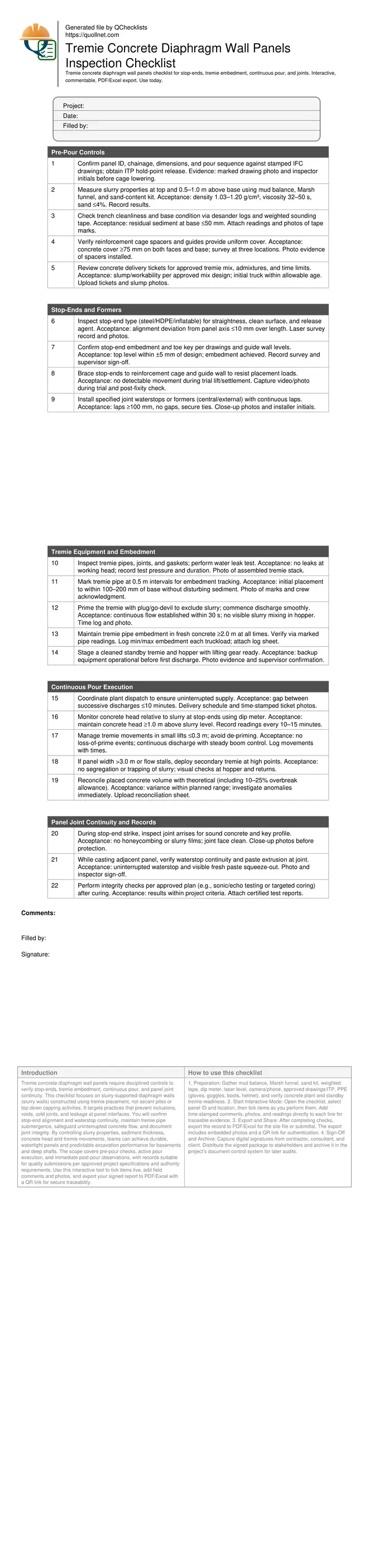 Tremie concrete diaphragm wall panels require disciplined controls to verify stop-ends, tremie embedment, continuous pour, and panel joint continuity. This checklist focuses on slurry-supported diaphragm walls (slurry walls) constructed using tremie placement, not secant piles or top-down capping activities. It targets practices that prevent inclusions, voids, cold joints, and leakage at panel interfaces. You will confirm stop-end alignment and waterstop continuity, maintain tremie pipe submergence, safeguard uninterrupted concrete flow, and document joint integrity. By controlling slurry properties, sediment thickness, concrete head and tremie movements, teams can achieve durable, watertight panels and predictable excavation performance for basements and deep shafts. The scope covers pre-pour checks, active pour execution, and immediate post-pour observations, with records suitable for quality submissions per approved project specifications and authority requirements. Use this interactive tool to tick items live, add field comments and photos, and export your signed report to PDF/Excel with a QR link for secure traceability.