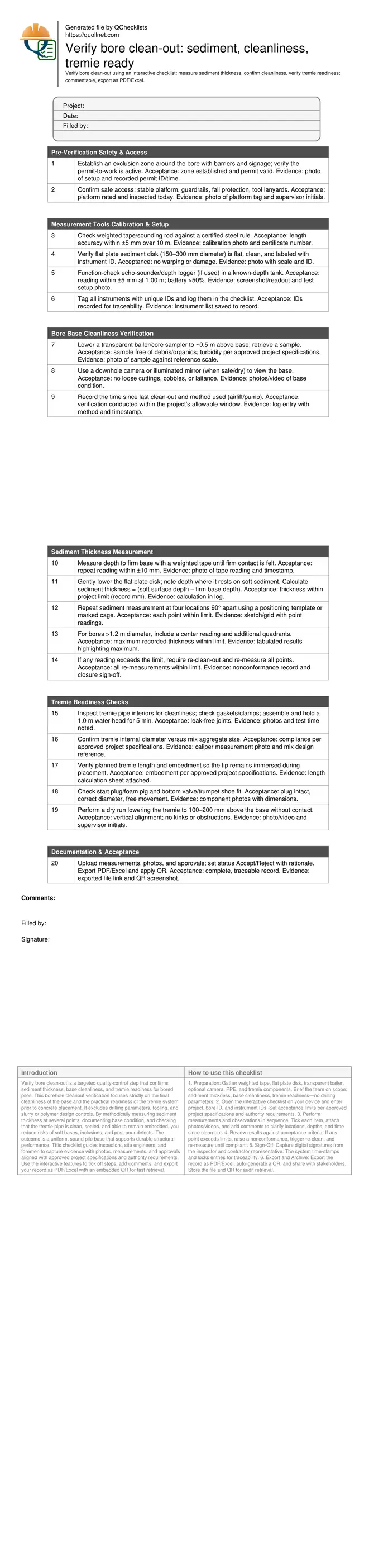 Verify bore clean-out is a targeted quality-control step that confirms sediment thickness, base cleanliness, and tremie readiness for bored piles. This borehole cleanout verification focuses strictly on the final cleanliness of the base and the practical readiness of the tremie system prior to concrete placement. It excludes drilling parameters, tooling, and slurry or polymer design controls. By methodically measuring sediment thickness at several points, documenting base condition, and checking that the tremie pipe is clean, sealed, and able to remain embedded, you reduce risks of soft bases, inclusions, and post-pour defects. The outcome is a uniform, sound pile base that supports durable structural performance. This checklist guides inspectors, site engineers, and foremen to capture evidence with photos, measurements, and approvals aligned with approved project specifications and authority requirements. Use the interactive features to tick off steps, add comments, and export your record as PDF/Excel with an embedded QR for fast retrieval.