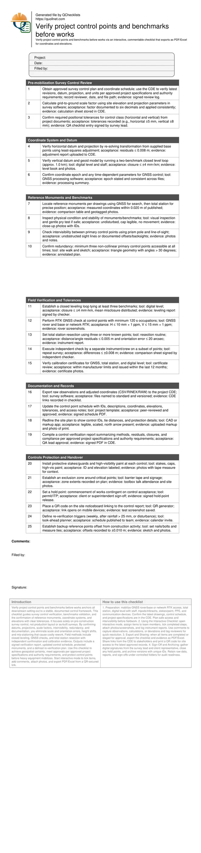 Verify project control points and benchmarks before works anchors all downstream setting-out to a stable, documented control framework. This checklist guides survey control verification, benchmarks validation, and the confirmation of reference monuments, coordinate systems, and elevations with clear tolerances. It focuses solely on pre-construction survey control, not production layout or as-built surveys. By confirming datums, projections, scale factors, intervisibility, redundancy, and documentation, you eliminate scale and orientation errors, height shifts, and mis-stationing that cause costly rework. Field methods include closed leveling, GNSS checks, and total station resection with independent confirmation and calibration evidence. Outputs include a signed verification report, updated control schedule, protected monuments, and a defined re-verification plan. Use this checklist to achieve geospatial certainty, meet approvals per approved project specifications and authority requirements, and protect control points before heavy equipment mobilizes. Start interactive mode to tick items, add comments, attach photos, and export PDF/Excel from a QR-secured link.