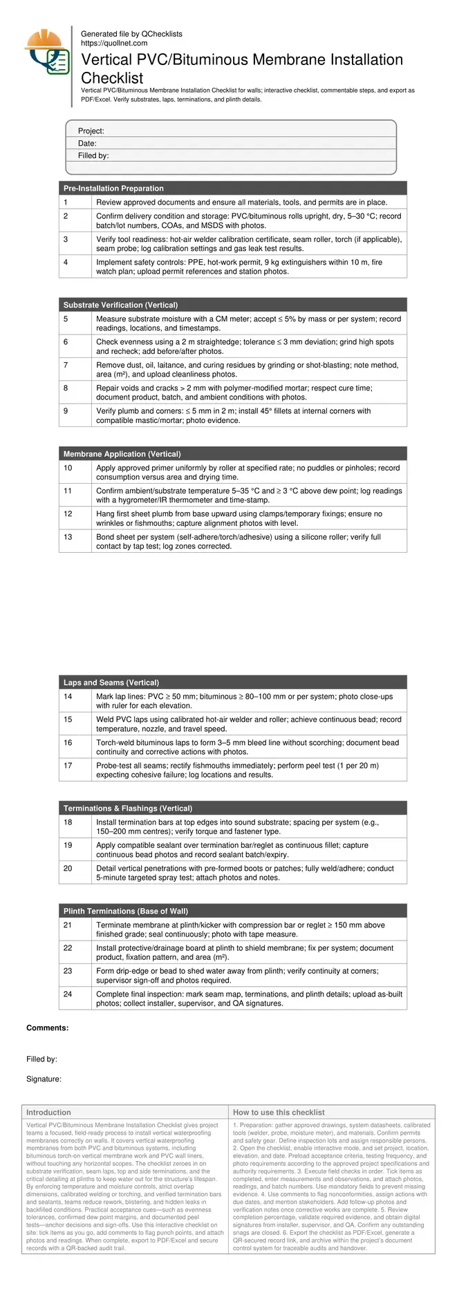 Vertical PVC/Bituminous Membrane Installation Checklist gives project teams a focused, field-ready process to install vertical waterproofing membranes correctly on walls. It covers vertical waterproofing membranes from both PVC and bituminous systems, including bituminous torch-on vertical membrane work and PVC wall liners, without touching any horizontal scopes. The checklist zeroes in on substrate verification, seam laps, top and side terminations, and the critical detailing at plinths to keep water out for the structure’s lifespan. By enforcing temperature and moisture controls, strict overlap dimensions, calibrated welding or torching, and verified termination bars and sealants, teams reduce rework, blistering, and hidden leaks in backfilled conditions. Practical acceptance cues—such as evenness tolerances, confirmed dew point margins, and documented peel tests—anchor decisions and sign-offs. Use this interactive checklist on site: tick items as you go, add comments to flag punch points, and attach photos and readings. When complete, export to PDF/Excel and secure records with a QR-backed audit trail.