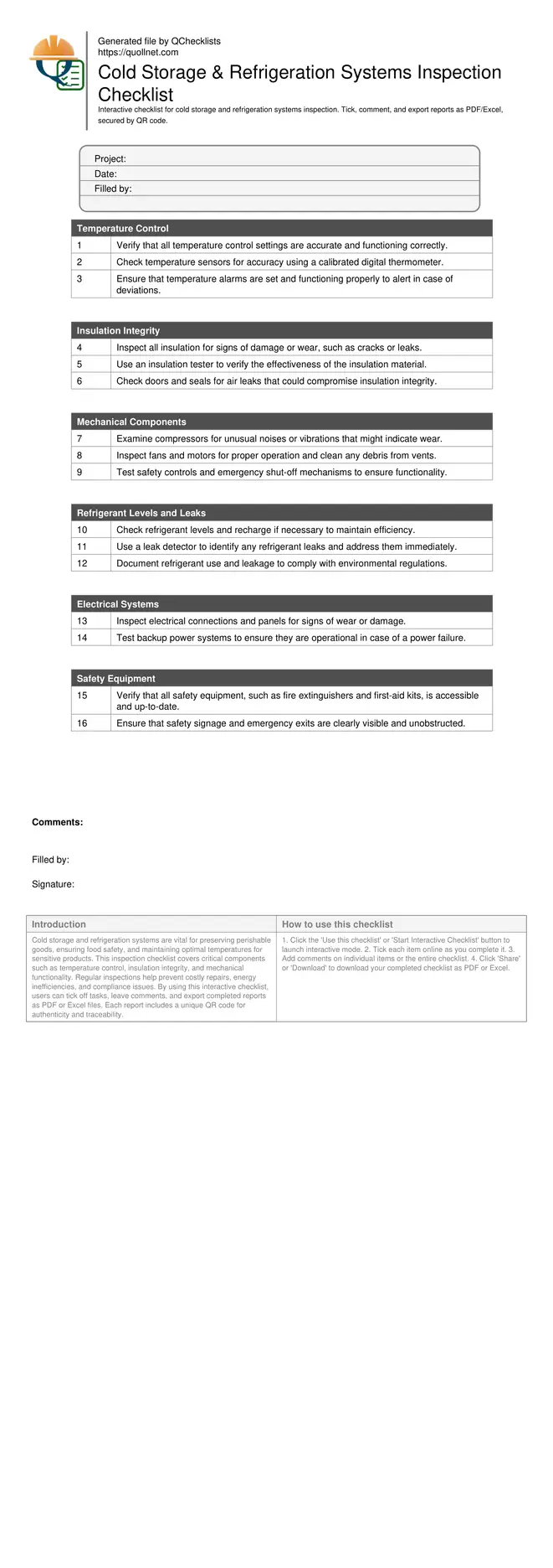 Cold storage and refrigeration systems are vital for preserving perishable goods, ensuring food safety, and maintaining optimal temperatures for sensitive products. This inspection checklist covers critical components such as temperature control, insulation integrity, and mechanical functionality. Regular inspections help prevent costly repairs, energy inefficiencies, and compliance issues. By using this interactive checklist, users can tick off tasks, leave comments, and export completed reports as PDF or Excel files. Each report includes a unique QR code for authenticity and traceability.