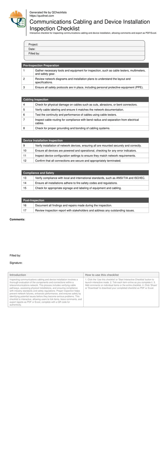 Inspecting communications cabling and device installation involves a thorough evaluation of the components and connections within a telecommunications network. This process includes verifying cable pathways, assessing physical installations, and ensuring compliance with industry standards and safety regulations. Proper inspection helps prevent network failures, enhances performance, and ensures safety by identifying potential issues before they become serious problems. This checklist is interactive, allowing users to tick items, leave comments, and export reports as PDF or Excel, complete with a QR code for authenticity.