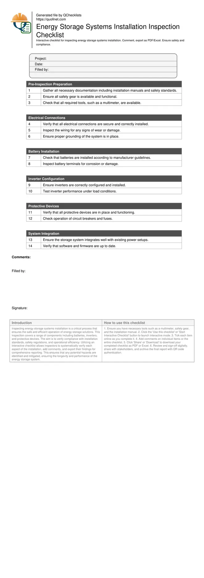 Inspecting energy storage systems installation is a critical process that ensures the safe and efficient operation of energy storage solutions. This inspection covers a range of components including batteries, inverters, and protective devices. The aim is to verify compliance with installation standards, safety regulations, and operational efficiency. Utilizing an interactive checklist allows inspectors to systematically verify each aspect of the installation, add comments, and export their findings for comprehensive reporting. This ensures that any potential hazards are identified and mitigated, ensuring the longevity and performance of the energy storage system.
