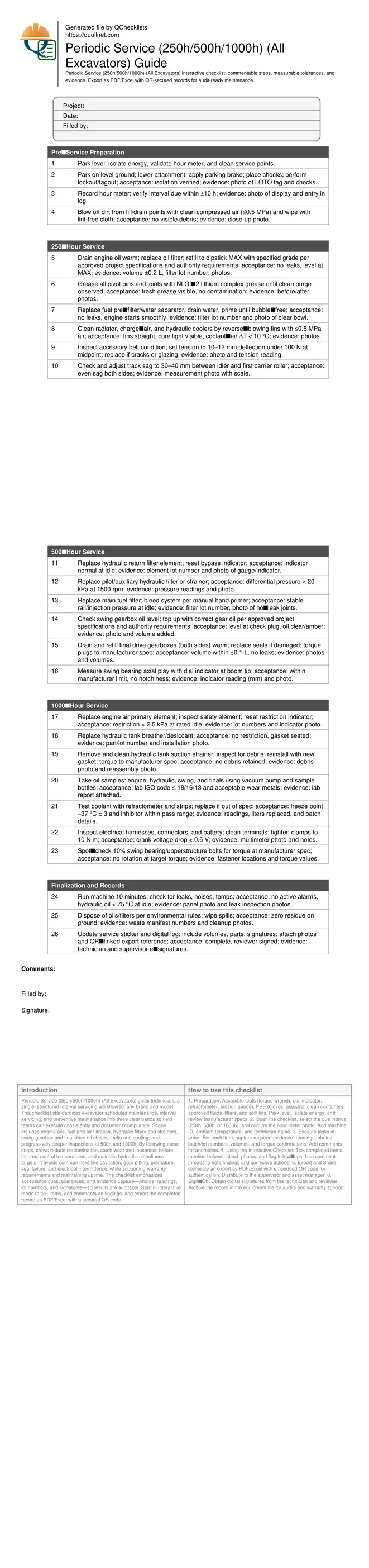 Periodic Service (250h/500h/1000h) (All Excavators) gives technicians a single, structured interval servicing workflow for any brand and model. This checklist standardizes excavator scheduled maintenance, interval servicing, and preventive maintenance into three clear bands so field teams can execute consistently and document compliance. Scope includes engine oils, fuel and air filtration, hydraulic filters and strainers, swing gearbox and final drive oil checks, belts and cooling, and progressively deeper inspections at 500h and 1000h. By following these steps, crews reduce contamination, catch wear and looseness before failures, control temperatures, and maintain hydraulic cleanliness targets. It avoids common risks like cavitation, gear pitting, premature seal failure, and electrical intermittence, while supporting warranty requirements and maintaining uptime. The checklist emphasizes acceptance cues, tolerances, and evidence capture—photos, readings, lot numbers, and signatures—so results are auditable. Start in interactive mode to tick items, add comments on findings, and export the completed record as PDF/Excel with a secured QR code.