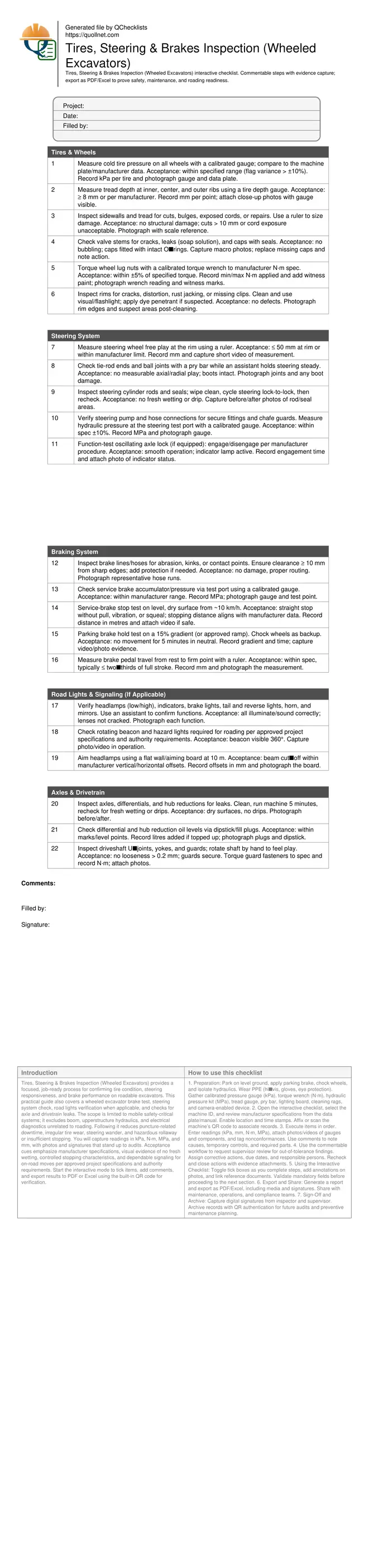 Tires, Steering & Brakes Inspection (Wheeled Excavators) provides a focused, job-ready process for confirming tire condition, steering responsiveness, and brake performance on roadable excavators. This practical guide also covers a wheeled excavator brake test, steering system check, road lights verification when applicable, and checks for axle and drivetrain leaks. The scope is limited to mobile safety-critical systems; it excludes boom, upperstructure hydraulics, and electrical diagnostics unrelated to roading. Following it reduces puncture-related downtime, irregular tire wear, steering wander, and hazardous rollaway or insufficient stopping. You will capture readings in kPa, N·m, MPa, and mm, with photos and signatures that stand up to audits. Acceptance cues emphasize manufacturer specifications, visual evidence of no fresh wetting, controlled stopping characteristics, and dependable signaling for on-road moves per approved project specifications and authority requirements. Start the interactive mode to tick items, add comments, and export results to PDF or Excel using the built-in QR code for verification.
