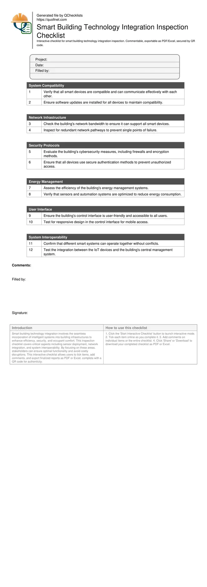 Smart building technology integration involves the seamless incorporation of intelligent systems into building infrastructures to enhance efficiency, security, and occupant comfort. This inspection checklist covers critical aspects including sensor deployment, network integration, and system interoperability. By focusing on these areas, stakeholders can ensure optimal functionality and avoid costly disruptions. This interactive checklist allows users to tick items, add comments, and export finalized reports as PDF or Excel, complete with a QR code for authenticity.