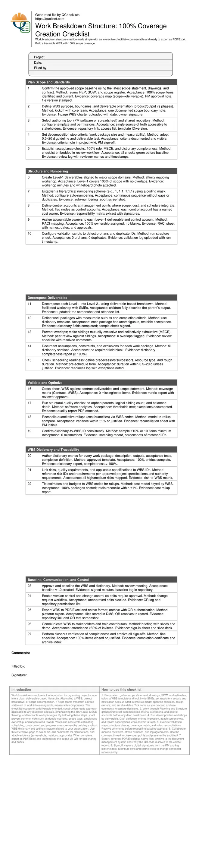 Work breakdown structure is the foundation for organizing project scope into a clear, deliverable-based hierarchy. Also called a WBS, project breakdown, or scope decomposition, it helps teams transform a broad statement of work into manageable, measurable components. This checklist focuses on a deliverable-oriented, construction-ready approach applicable to any discipline and size, emphasizing the 100% rule, MECE thinking, and traceable work packages. By following these steps, you’ll prevent common risks such as double-counting, scope gaps, ambiguous ownership, and uncontrolled rework. You’ll also accelerate estimating, scheduling, cost control, and progress measurement by building a robust WBS dictionary and coding structure aligned to your organization. Use this interactive page to tick items, add comments for clarifications, and attach evidence (screenshots, matrices, approvals). When complete, export as PDF/Excel and authenticate the output via QR for fast sharing and audits.