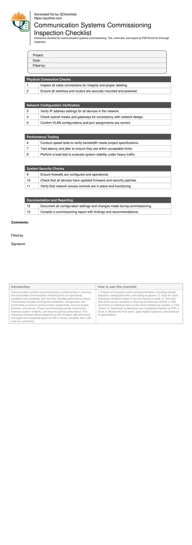 Communication systems commissioning is a critical phase in ensuring that all installed communication infrastructures are operational, compliant with standards, and meet the intended performance criteria. This process includes verifying the installation, configuration, and functionality of various communication components, such as routers, switches, and servers. Proper commissioning avoids costly errors, improves system reliability, and ensures optimal performance. This interactive checklist allows inspectors to tick off tasks, add comments, and export the completed report as PDF or Excel, complete with a QR code for authenticity.