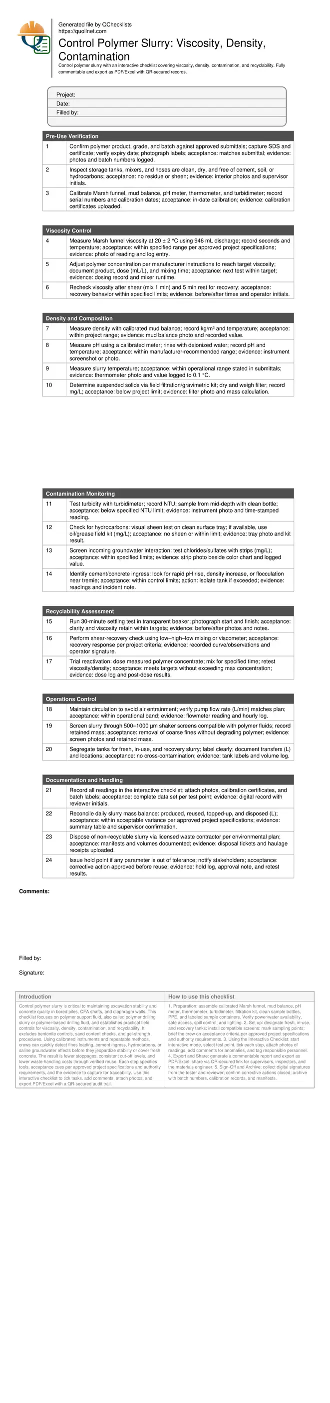 Control polymer slurry is critical to maintaining excavation stability and concrete quality in bored piles, CFA shafts, and diaphragm walls. This checklist focuses on polymer support fluid, also called polymer drilling slurry or polymer-based drilling fluid, and establishes practical field controls for viscosity, density, contamination, and recyclability. It excludes bentonite controls, sand content checks, and gel-strength procedures. Using calibrated instruments and repeatable methods, crews can quickly detect fines loading, cement ingress, hydrocarbons, or saline groundwater effects before they jeopardize stability or cover fresh concrete. The result is fewer stoppages, consistent cut-off levels, and lower waste-handling costs through verified reuse. Each step specifies tools, acceptance cues per approved project specifications and authority requirements, and the evidence to capture for traceability. Use this interactive checklist to tick tasks, add comments, attach photos, and export PDF/Excel with a QR-secured audit trail.