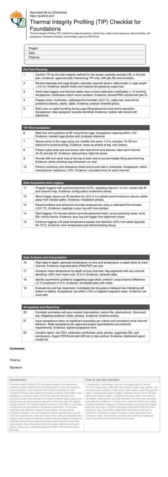 Thermal Integrity Profiling (TIP) provides a reliable, non-destructive method to assess drilled shafts and bored piles by using the concrete’s heat of hydration. This checklist covers thermal profiling from wire installation through heat signature recording, anomaly identification, and acceptance. It focuses solely on TIP and explicitly excludes CSL, ensuring a single clear procedure for deep foundation quality assurance. By placing temperature sensors along the reinforcing cage and logging at tight intervals, TIP reveals necking, inclusions, soft bottoms, and cage misalignment as characteristic temperature deviations. The process improves early detection, reduces costly rework, and documents foundation integrity in SI units suitable for design and authority records. Users will plan the test, install and verify wires, configure calibrated data loggers, capture pour timestamps, analyse traces by depth, and issue an acceptance decision per approved project specifications and authority requirements. Start interactive mode to tick tasks, add comments and photos, and export consolidated reports to PDF or Excel with a secure QR code.