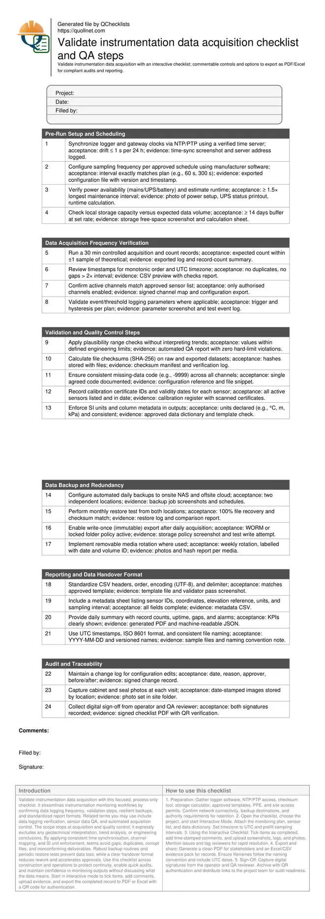 Validate instrumentation data acquisition with this focused, process-only checklist. It streamlines instrumentation monitoring workflows by confirming data logging frequency, validation steps, resilient backups, and standardized report formats. Related terms you may use include data logging verification, sensor data QA, and automated acquisition control. The scope stops at acquisition and quality control; it expressly excludes any geotechnical interpretation, trend analysis, or engineering conclusions. By applying consistent time synchronisation, channel mapping, and SI unit enforcement, teams avoid gaps, duplicates, corrupt files, and nonconforming deliverables. Robust backup routines and periodic restore tests prevent data loss, while a clear handover format reduces rework and accelerates approvals. Use this checklist across construction and operations to protect continuity, enable quick audits, and maintain confidence in monitoring outputs without discussing what the data means. Start in interactive mode to tick items, add comments, upload evidence, and export the completed record to PDF or Excel with a QR code for authentication.