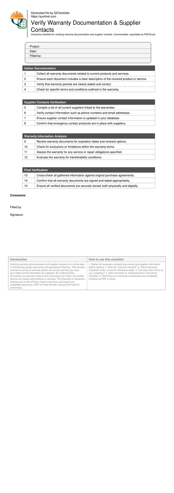 Verifying warranty documentation and supplier contacts is a critical step in maintaining quality assurance and operational efficiency. This process involves ensuring all warranty details are correct and that you have up-to-date contact information for suppliers. By verifying these documents, you prevent costly errors and ensure your team can quickly resolve any issues with products or services. This checklist is interactive, allowing you to tick off items, leave comments, and export your completed reports as a PDF or Excel file with a secure QR code for authenticity.
